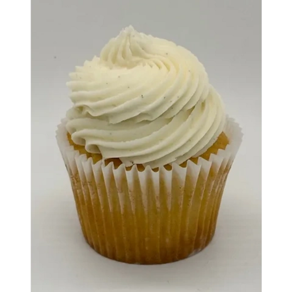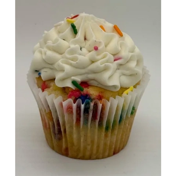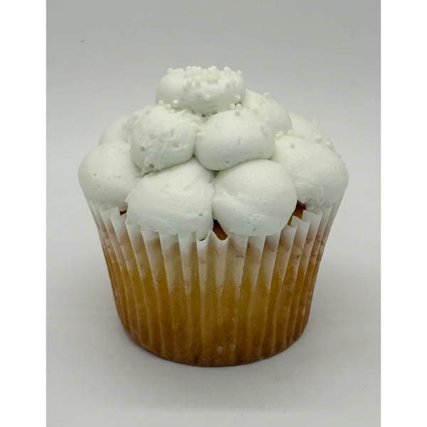 An almond cupcake topped with a homemade almond buttercream, & garnished with white nonpareils!