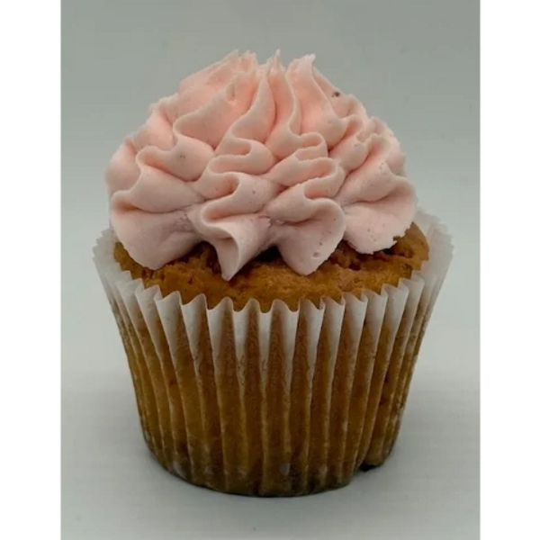 A strawberry cupcake topped with our homemade strawberry buttercream!