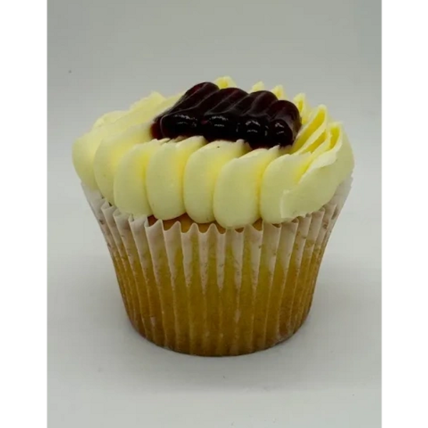 A lemon cupcake with a raspberry filling, topped with our homemade lemon buttercream, & garnished with raspberry filling!