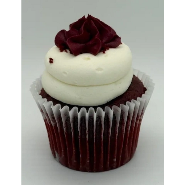 A red velvet cupcake, topped with a homemade cream cheese buttercream, & garnished with a dollop of red cream cheese icing and red velvet cake crumbs!